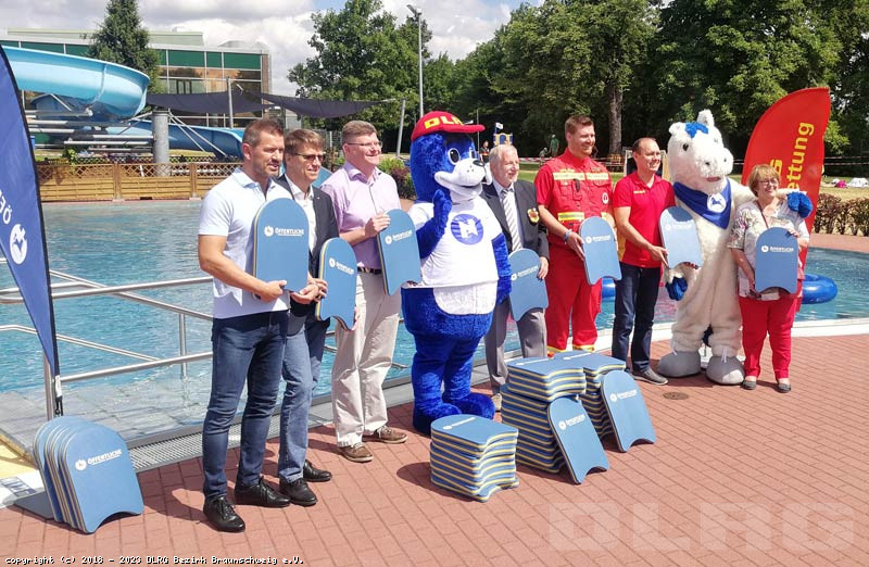 Königslutter/Braunschweig (gm). Die Ortsgruppe Königslutter freut sich. Als Ausrichter des Kinderaktionstags bekamen die Vertreter der Ortsgruppe von der Öffentlichen Versicherung Braunschweig 50 neue Schwimmbretter überreicht. "Die Schwimmbretter helfen uns sehr bei der Schwimmausbildung", freute sich Tim Junge, Ortsgruppenleiter in Königslutter. Seine Helfer und er hatten sich ordentlich ins Zeug gelegt: mit Hüpfburg, begehbaren Wasserbällen, Erste Hilfe-Stand zum Üben der Herz- Lungen-Widerbelebung und vielfältigem Infomaterial über die DLRG allgemein und Rettungsvorführungen wurde ein buntes Programm geboten. Unser Partner, die Öffentliche Versicherung Braunschweig war ebenfalls mit einem eigenen Infotstand vor Ort und beide Maskottchen "Öfi" und "Nobbi" durften natürlich auch nicht fehlen!