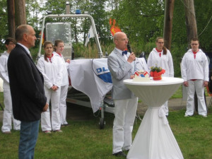 Die Festredner wünschten allesamt dem neuen Einsatzboot allzeit gute Fahrt und eine "Handbreit Wasser unter dem Kiel", wobei Bezirksleiter Helmut Fichtner gleich erläuterte, dass das neue Boot einen Katamaran-Rumpf hat und nicht viel Wasser unter dem Kiel benötigt.