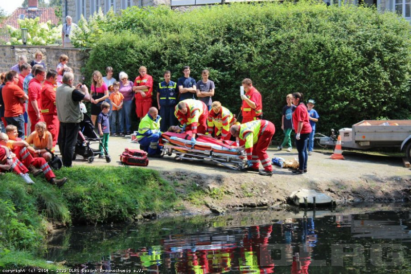 Höhepunkt des Tages war die Rettungsübung gemeinsam mit dem ASB und Einsatztauchern der Polizei. Folgendes war geschehen: Eine Passantin ist vom Weg abgekommen und mit ihrem Fahrrad in den Burggraben gestürzt. Ein Rettungsschwimmer eilte der Passantin zur Hilfe und hat diese fachmännisch abgeschleppt und anschließend an den bereits wartenden Sanitätstrupp der DLRG per Hochzeitstragegriff übergeben. Sanitäter der DLRG übernahmen die Erstversorgung bis der alarmierte Rettungsdienst des ASB eingetroffen ist. Dieser übernahm dann die weitere Versorgung sowie den Transport zum nächsten Krankenhaus. Während die verunfallte Person betreut wurde, begannen die Einsatztaucher der Polizei mit Hilfe des beobachtenden Rettungsschwimmers die Suche nach dem Fahrrad im knapp drei Meter tiefen Burgteich. Sowohl die verunfallte Person als auch das Fahrrad könnten schnell gerettet werden. Die Einsatzübung lief zügig und fehlerfrei ab.