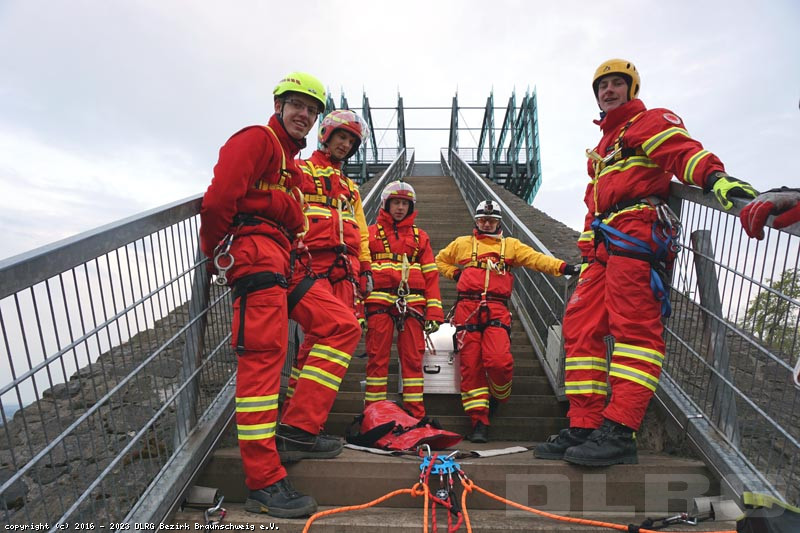 Der Samstag startete wieder mit einem Theorieblock am Vormittag. Dabei wurden die Standardverfahren der DLRG in Sachen Aufbau und Funktionsweise durchgesprochen. Einige dieser Standards wie zum Beispiel das Abseilen oder das Sichern im Vorstieg sollten dann am Nachmittag auch noch ihre praktische Anwendung finden. Dazu verlegte die Truppe nach Steinbergen zum Steinzeichen. Das Steinzeichen ist ein Naturpark in Sichtweite der A2 und liegt direkt neben einem Steinbruch. Vom dort befindlichen Aussichtsturm wurden dann die eben erwähnten Standards geübt. Zum Abschluss des langen Tages thematisierte der Lehrgang auch noch die Rettung am Schräghang und simulierte dabei eine Rettung einer Person, die auf der Treppe des Aussichtsturms verunglückte.