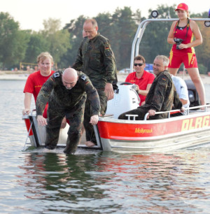 Zum Abschluss des offiziellen Teils standen noch eine Fahrt im Rettungsboot sowie das 100m Kleiderschwimmen als Prüfungsleistung für die Reservisten auf dem Programm, wobei das Kleiderschwimmen vom Boot aus in Richtung Land gestartet wurde.